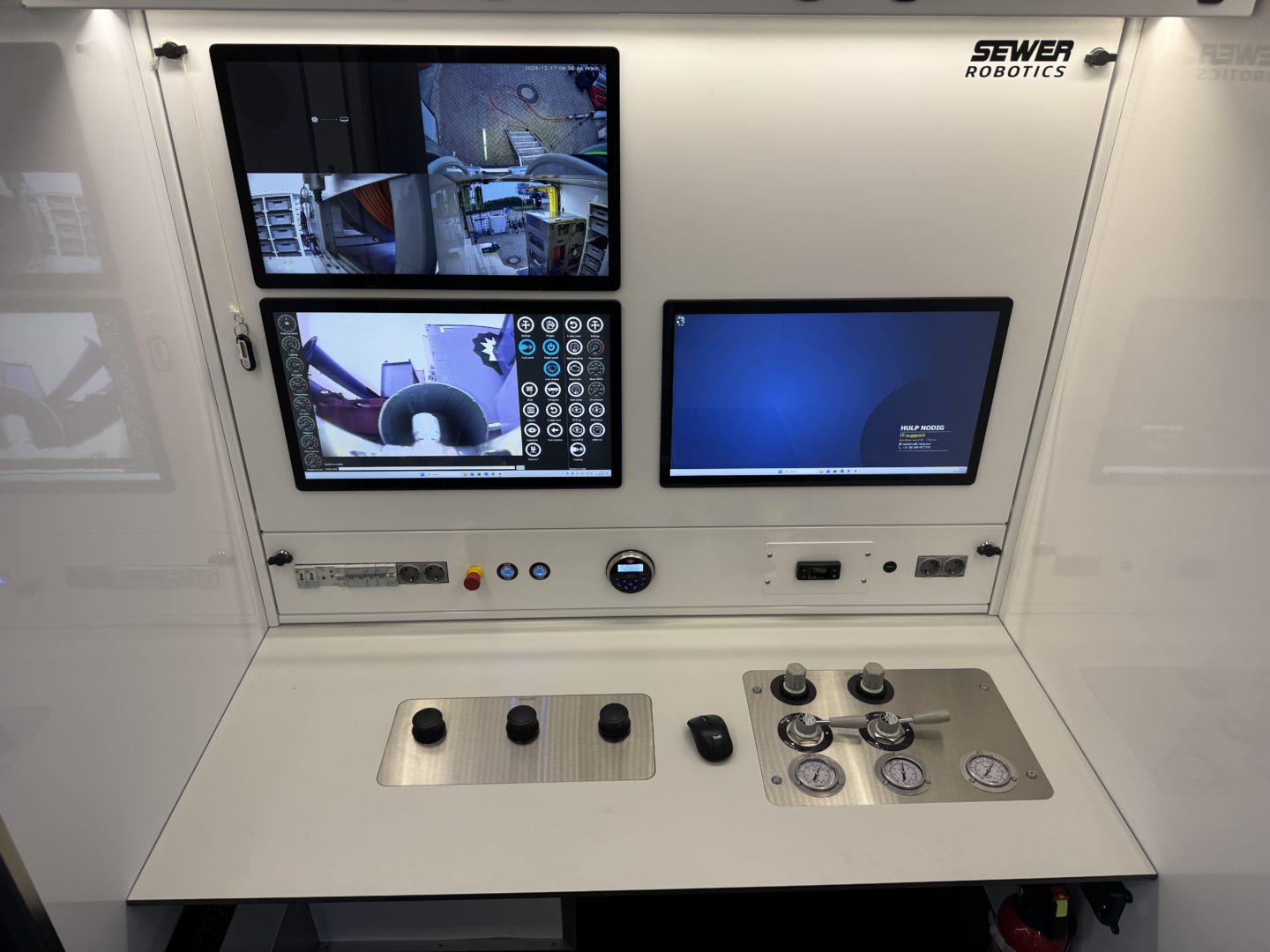 SEWER ROBOTICS box installations have everything exactly at the right place. Reels, robot storage and a workbench in the equipment compartment. Convenient touch screen controls and customizable joysticks, cabinetry with sufficient storage in a laboratory alike control studio and a powerful high-pressure unit with water- and power supplies in the engine room.